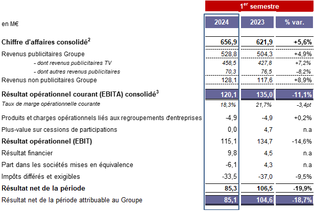 - Au 1er semestre de l’exercice 2024, le Groupe M6 enregistre un chiffre d’affaires consolidé de 656,9 M€, en hausse de +7,1% à périmètre constant.