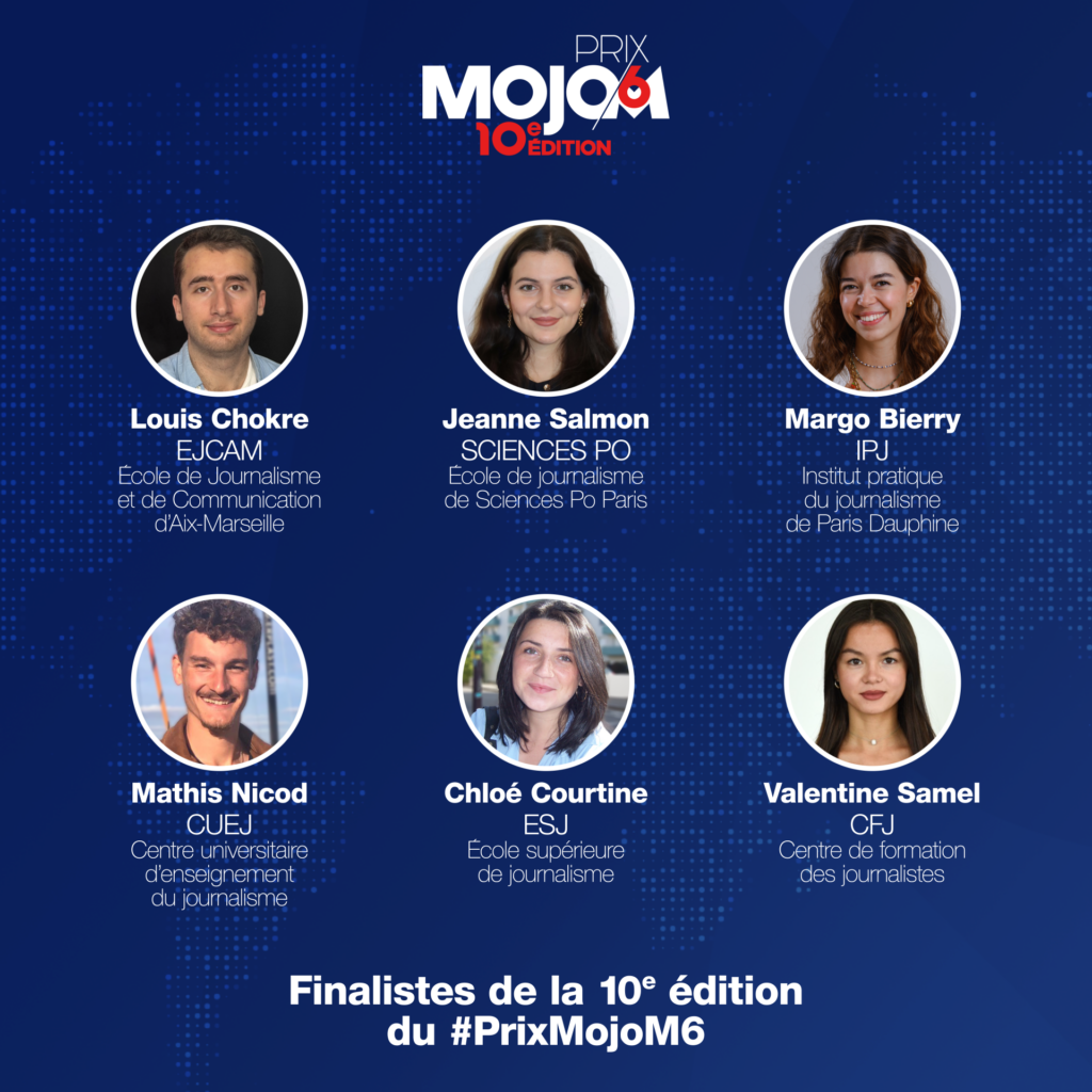 Le jury composé de Stéphane Gendarme – Directeur de l’Information – Rédaction M6, Ashley Chevalier – Journaliste, Présentatrice des 1245 et 1945 week-end – Rédaction M6, Sarah-Lou Cohen-Bacri – Directrice Adjointe de la Rédaction RTL, Ingrid Carré Britsch – Rédactrice en Chef – Rédaction M6, Laurie Desorgher – Rédactrice en Chef Adjointe – Rédaction M6, Pascal Melkonian – Rédacteur en Chef Adjoint – Rédaction M6 et Thierry Combrexelle – Directeur de la Communication Interne, de la Marque Employeur et du Développement RH – Groupe M6, a désigné les 6 finalistes de la 10ème édition du #PrixMojoM6.