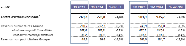 - Chiffre d’affaires de 269,2 M€ dont 220,7 M€ pour les revenus publicitaires (stables vs. T3 2024)
