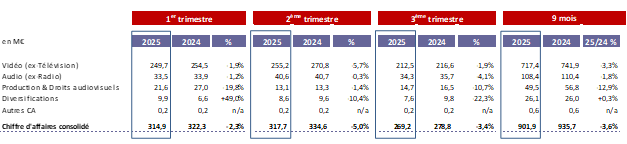 Au 30 septembre 2025, le chiffre d’affaires consolidé5 du Groupe s’établit à 901,9 M€. Le chiffre d’affaires publicitaire vidéo est en légère baisse de -1,5% par rapport au 30 septembre 2024, marqué par un effet de base lié à la diffusion de l’Euro 2024 l’an passé et soutenu par l’activité streaming qui affiche des revenus en forte hausse (+30% sur un an).